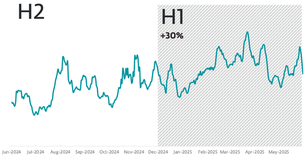 Détections de ransomware de Juin 2024 à mai 2025 (source : ESET Threat Report H1 2025)